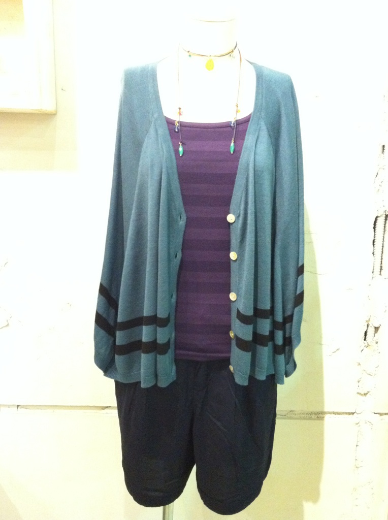 まだまだ暑さが厳しいですが秋物のご紹介。ボーダーラインの入ったカーディです。